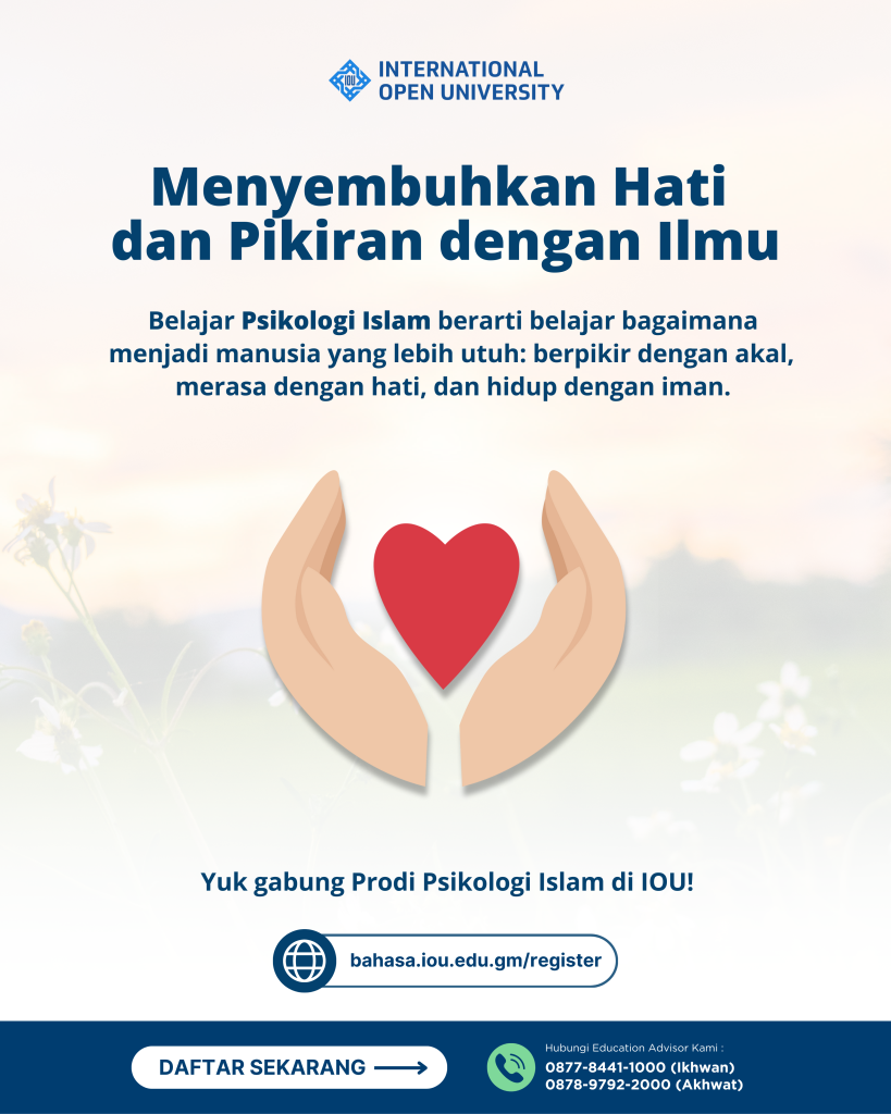 International Open University (IOU) menghadirkan pendekatan ini dalam program studi Psikologi Islam baik di tingkat sarjana maupun pascasarjana. Mahasiswa tidak hanya mempelajari teori-teori psikologi modern, tetapi juga bagaimana nilai-nilai Al-Qur’an dan Sunnah menjadi fondasi dalam memahami dan merawat jiwa.