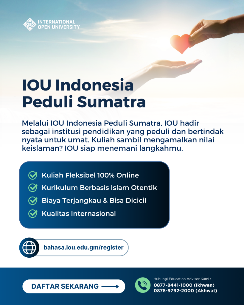 Melalui program IOU Indonesia Peduli Sumatra, IOU menegaskan perannya bukan hanya sebagai institusi pendidikan global, tetapi juga sebagai bagian dari umat yang hadir, peduli, dan bertindak nyata di saat saudara-saudaranya tertimpa musibah.Ingin berkuliah dan tetap dapat bersosial serta mengaplikasikan nilai keislaman? Yuk sangat bisa melalui IOU, kunjungi website kami di bahasa.iou.edu.gm yaa